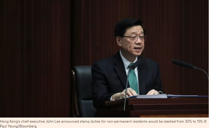 Lee said Hong Kong would also trim a stamp duty on stock market transactions from 0.13 per cent to 0.1 per cent to shore up trading volumes in its $4tn equities market, and announced a new entry scheme for investors who committed HK$30mn or relocated assets including stocks, funds and bonds to the Chinese territory.